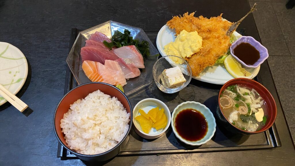 今日は近所のなつ梅さんで食事。アジフライうまし!!